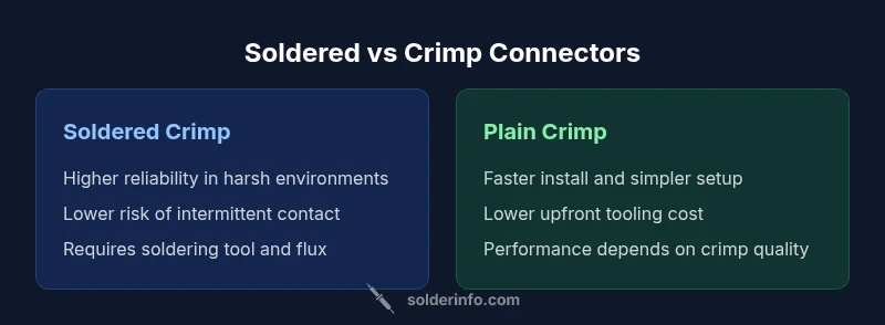For many projects, you can rely on a high-quality crimp connection, but in vibration-prone, moisture-exposed, or safety-critical environments, adding solder can improve reliability. This comparison dives into when soldered crimps outperform plain crimps and when a plain crimp suffices. Using proper tooling, prepared materials, and good workmanship, you’ll be able to balance speed, cost, and durability. According to SolderInfo, evaluating environment and service life is key to answering do you need to solder crimp connectors for your specific use case.
