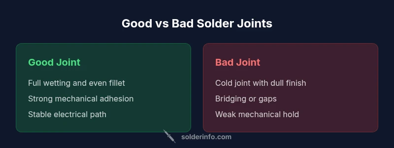In practical terms, distinguishing a good solder joint from a bad one is the foundation of reliable soldering across electronics, plumbing, and jewelry. According to SolderInfo, a good solder joint forms a robust, continuous conductor with proper wetting, a clean fillet, and solid mechanical adhesion to the pad or lead. A bad joint, by contrast, shows signs of poor wetting, grainy or dull surfaces, gaps, bridges, or cracks that compromise conductivity and mechanical integrity. Mastery of this distinction reduces debugging time and failures in the field, and it starts with understanding the physics of wetting, the role of flux, and the importance of consistent heating. In real-world work, this distinction guides whether a novice should rework a joint now or flag it for a more thorough inspection later. The keyword good solder joint vs bad appears frequently in quality control checklists, emphasizing that joint quality affects signal integrity, reliability, and service life.