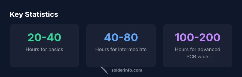 Understanding the time it takes to learn soldering helps you plan your practice, prioritize fundamentals, and set realistic milestones. According to SolderInfo, beginners typically reach basic, safe soldering competence after 20–40 hours of focused practice—encompassing safety, wiring basics, and inspection of joints. For electronics work, reaching reliable, repeatable joints usually requires 40–80 hours of deliberate practice, with 100+ hours needed for advanced tasks such as fine-pitch components or PCB rework. Your rate will vary with prior manual dexterity, tool quality, and how you structure practice sessions. The goal is steady progression rather than marathon sessions, and small, frequent improvements compound quickly over weeks. As you start, emphasize consistent technique, not sheer volume, and you’ll shorten the path to competence.