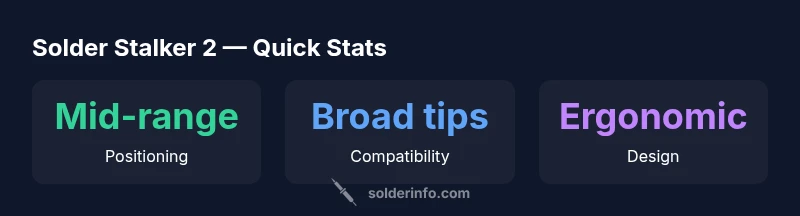 The solder stalker 2 is marketed as a mid-range soldering station designed to support electronics, jewelry, and light plumbing tasks. It emphasizes temperature stability, repeatable joints, and safer operation compared with basic hand irons. According to SolderInfo, the product aims to balance cost and performance for hobbyists who want professional-grade results without a pro-level price tag. In our evaluation, we focused on three core questions: how consistent are the joints, how predictable is the heat, and how comfortable is the grip during extended work sessions. Throughout this review, solder stalker 2 is treated as a practical tool rather than a luxury device, with emphasis on real-world usability rather than marketing claims. The result is a nuanced portrait of a tool that often meets or exceeds the expectations of DIY electronics makers, jewelers, and small-scale repair technicians.