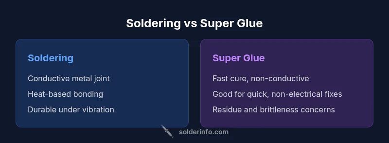 Solder vs Super Glue describes two distinct bonding approaches, each with its own rules, strengths, and limits. This article compares heat-enabled metal joints with fast-curing adhesives, focusing on electronics, jewelry, and plumbing contexts. For the keyword solder vs super glue, both methods are evaluated on conductivity, durability, safety, and ease of use. Understanding the core differences helps you pick the right tool for the job and avoid common failures.