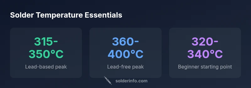 Typical soldering temperatures are 315-350°C for lead-based solders and 360-400°C for lead-free alloys. Beginners often start around 320-340°C for leaded solders and 360-380°C for lead-free, then adjust based on joint quality and component sensitivity. According to SolderInfo, matching alloy and temperature minimizes damage and ensures reliable joints.