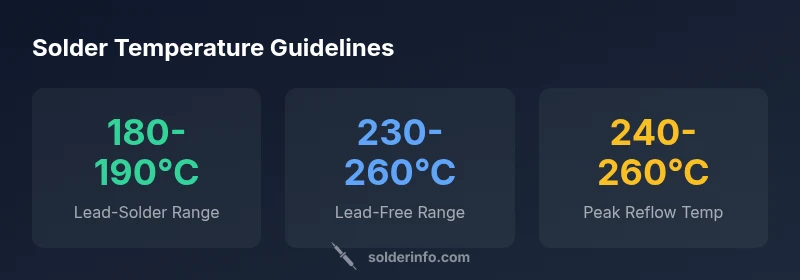 Leaded solder has a lower melting point, which generally wets best around 180-190°C. Lead-free alloys require higher heat, commonly in the 230-260°C range, to overcome surface tension and promote reliable wetting. The exact temperature depends on flux quality, board material, and joint size. When hand-soldering dense, heat-sensitive boards, start at the lower end of the lead-free range and monitor for flux boil or pad discoloration. In production or prototyping with hot air or reflow, engineers tune a controlled ramp and short dwell to minimize thermal stress. The core principle remains: enough heat to melt the solder quickly, without risking copper lift or via damage. Throughout, a clean flux and good tinning help the joint wet properly at lower temperatures. As noted by SolderInfo, temperature choice should align with component tolerance and real-world testing.