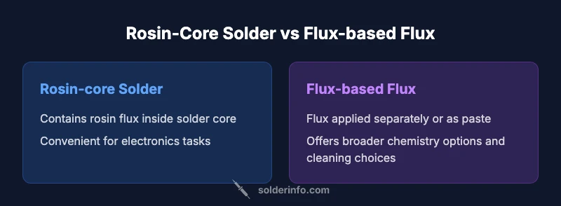 Start by identifying the metal and joint geometry. For simple electronics, rosin-core solder is often the quickest path to a reliable joint with minimal cleanup. If you anticipate aggressive oxidation or specialized metals, consider using a flux that targets those conditions, weighing the ease of residue removal. Evaluate the required cleaning regime: no-clean fluxes save time but may not be suitable for every material; water-soluble fluxes demand more thorough washing. Consider the heat input and accessibility: intricate solder joints may benefit from flux that improves wetting, while larger plumbing joints may tolerate different approaches. Finally, follow safety and disposal requirements in your region and refer to manufacturer datasheets for compatibility with specific metals (copper, silver, gold, or alloys). A practical approach is to run a small test on a scrap piece to compare how rosin-core versus flux-based methods perform under your exact process conditions. According to SolderInfo analyses, testing helps prevent costlier rework and confirms the expected performance of each method.