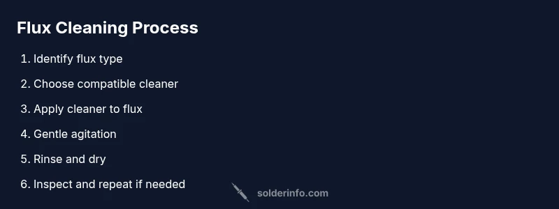 Prepare your workspace and PPE; ensure ventilation and a clean surface. Identify flux type and check manufacturer recommendations. Apply solvent to the flux, gently agitate with a soft brush, and rinse with IPA or flux cleaner. Dry with a forced-air blower or lint-free cloth, then inspect the joint under magnification. If residues persist, repeat cleaning or switch cleaners. Remember to power down and unplug devices during cleaning to avoid short circuits.