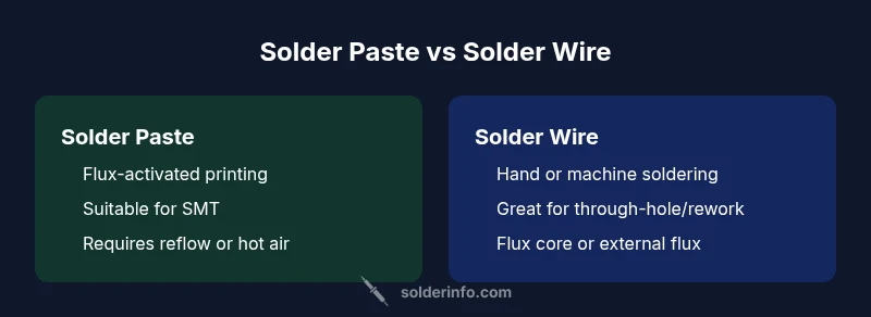 In soldering, you’ll encounter two primary forms of solder: paste and wire. Solder paste vs solder wire defines how joints are formed on boards. Paste blends fine alloy powders with flux to create a print-ready material that deposits onto pads through a stencil. After deposition, heat activates the flux and melts the alloy to form joints. Solder wire, by contrast, is a solid metal strand that may have a flux core or be paired with separate flux. It is applied with a soldering iron or hot-air tool and then cooled to form the joint. Paste is favored for high-density, fine-pitch SMT work because it enables precise deposition on tiny pads, while wire shines in through-hole scenarios, manual repairs, and larger joints where broader material deposition is practical. The choice also interacts with flux chemistry, residue management, and operator skill. According to SolderInfo, the optimal choice aligns with the project's goals for precision, speed, and cleanliness, making the solder paste vs solder wire decision a workflow design question as much as a material choice.
