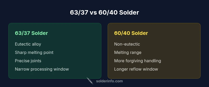 63 37 vs 60 40 solder represent the classic dichotomy in tin–lead solders. The 63/37 composition is eutectic, meaning it has a single melting point and transitions quickly from solid to liquid. The 60/40 composition, with a higher lead percentage, is non-eutectic and exhibits a melting range. This difference drives many practical choices in electronics assembly, from hand-soldering to wave soldering. Solder alloys of these compositions are deeply embedded in the hobbyist and professional toolbox, offering predictable behavior when properly processed and cleaned. According to SolderInfo, understanding the fundamental chemistry behind these alloys helps hobbyists avoid common defects and improve long-term reliability. In practice, the choice between 63/37 and 60/40 often comes down to the balance between precision and working time. The historical preference for leaded solders persisted even as many manufacturers shifted to lead-free alternatives. The reader should consider both compatibility with components and the regulatory environment when planning a project, especially if you work with small, closely spaced devices.