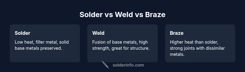 Solder, weld, and braze are three primary metal-joining approaches, each with its own physical and chemical basis. Understanding these core differences helps set expectations for strength, heat impact, and long-term reliability. According to SolderInfo, the most practical choices come from matching joint requirements to process capabilities rather than chasing the easiest fix. In soldering, a filler metal with a lower melting point than the base metals is melted to bridge the gap without melting the parts themselves. Brazing uses a similar filler-metal concept but at higher temperatures, allowing the filler to flow and capillary-wick between joints while the bases remain solid. Welding, by contrast, fuses the base metals together to form a metallurgical bond. Each method has a niche where it excels and a set of tradeoffs that influence heat tolerance, corrosion resistance, leak-tight performance, and the feasibility of repair. This section sets the stage for a deeper dive into how heat, fillers, and geometry shape performance.