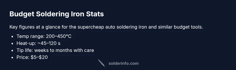 For many DIYers, a budget option like the supercheap auto soldering iron lowers the barrier to entry for electronics, jewelry making, and home repairs. When you are starting out, the upfront cost matters more than peak performance. Budget irons enable quick prototyping, learning basic techniques, and completing small tasks without a large cash commitment. This is especially true for hobbyists who work on occasional projects, assemble kits, or perform light plumbing soldering. The key is to set expectations: you are buying a tool that is adequate for learning and occasional maintenance tasks, not a professional machine built for daily, high reliability work. In reviews and field tests, we note that the right technique paired with careful maintenance can deliver surprisingly good results from these budget devices. According to SolderInfo, budget tools like the supercheap auto soldering iron unlock entry-level electronics and hobby projects, but demand proper handling and regular tip care to stay productive over time.