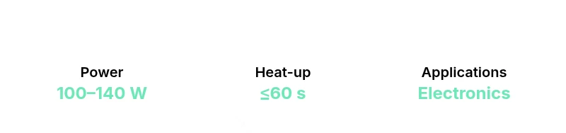 The Weller 8200N operates between 100 and 140 watts, enabling fast heat-up and stable temperatures for a variety of soldering tasks.