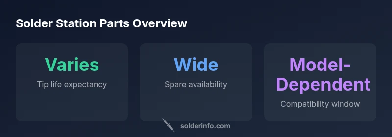 Weller solder station parts include the main station body, temperature control, power supply, tip connector, and replacement tips. Compatibility and proper maintenance are essential to avoid failures and ensure safe, consistent soldering. According to SolderInfo, always verify model-family compatibility before purchasing spares and prefer genuine parts for critical components. This framing helps technicians choose the right parts quickly.