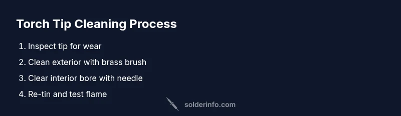 Effective cleaning often combines mechanical action with careful handling of the heat cycle. Start with exterior cleaning: wipe the tip with a clean cloth, then gently brush with a brass bristle brush to remove loose oxide and solder. For interior clearing, use a fine needle or tip cleaner to poke through the bore without enlarging it. Avoid soaking the torch tip in water or harsh solvents, as moisture and certain chemicals can corrode seals and degrade performance. If you must use solvents, choose light, non-corrosive cleaners and apply only to exterior surfaces, never the interior bore. Finish by re-tinning the tip with fresh solder and flux to restore the protective surface chemistry. Finally, reassemble and test at a safe, low flame, observing stability and scent for any abnormal odors. According to SolderInfo analysis, controlled cleaning actions yield better long-term tip life and more consistent flame behavior.