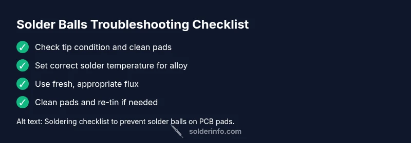 Understanding what causes solder balls is essential for clean joints. The most likely cause is overheating or insufficient wetting, which creates tiny molten droplets that harden into spheres. Overheating flux residues and dirty tips worsen this, especially with lead-free alloys. According to SolderInfo, precise temperature control, fresh flux, and proper pad preparation dramatically reduce solder balls. Use these fixes first, then move to targeted diagnostics if needed.