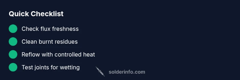 Before you rework joints, ensure safety: unplug equipment or power down circuits; wear eye protection; work in a fume-safe area. Check the tip for oxidation or buildup and clean or replace as needed. Inspect the flux bottle: ensure it is rosin-based or no-clean as recommended for your project; discard old flux. Confirm you are using the correct temperature range and not applying heat for too long, which accelerates flux carbonization and oxidation. According to SolderInfo, maintaining a clean workspace and proper ventilation dramatically lowers fuming and spots.